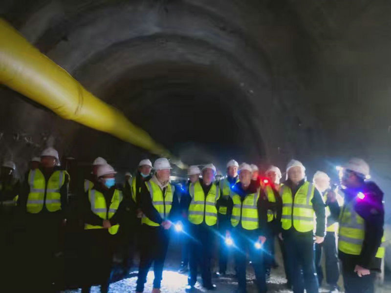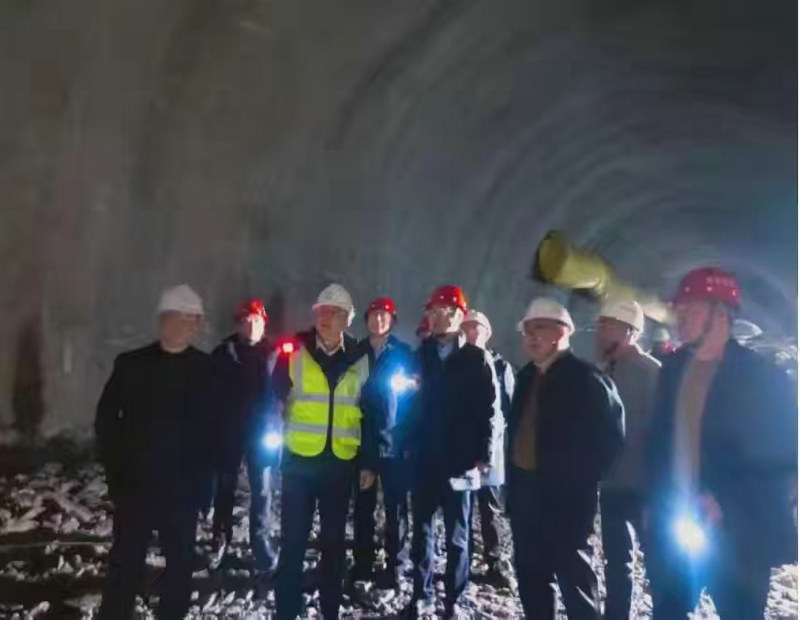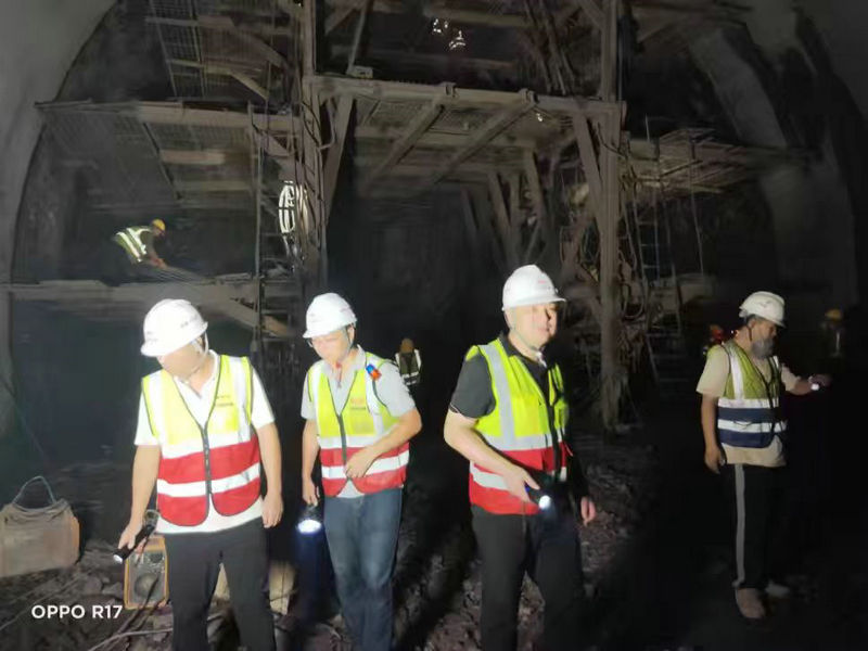 總承包部指揮長李兵(前排右二)、項(xiàng)目部經(jīng)理阮超(前排左二)在中梁山隧道進(jìn)口掌子面檢查指導(dǎo)
