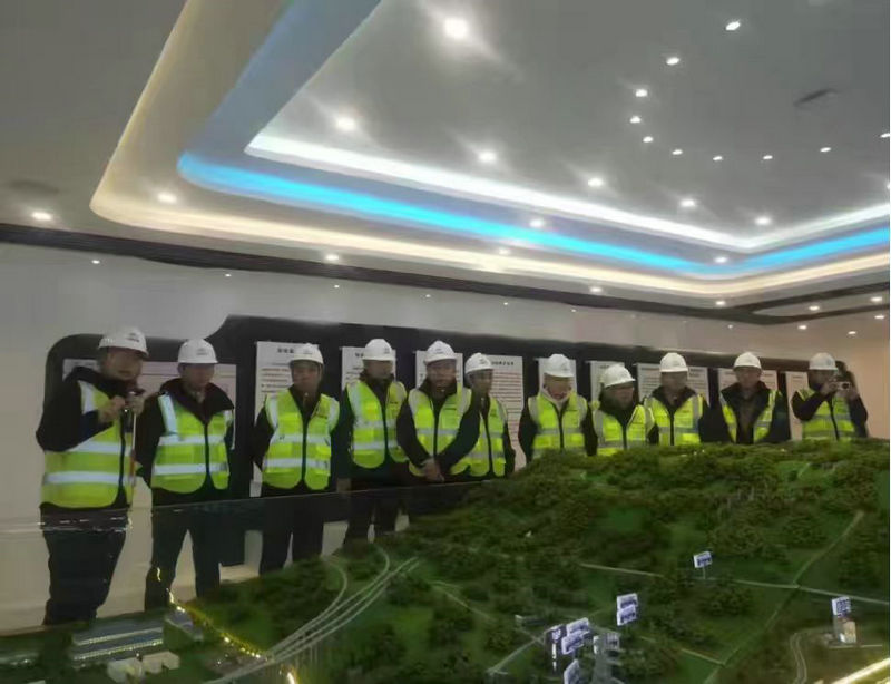 項(xiàng)目部總工程師李文慶(左一)向觀摩團(tuán)介紹智慧信息化中心助力施工生產(chǎn)技術(shù)引領(lǐng)發(fā)揮的作用