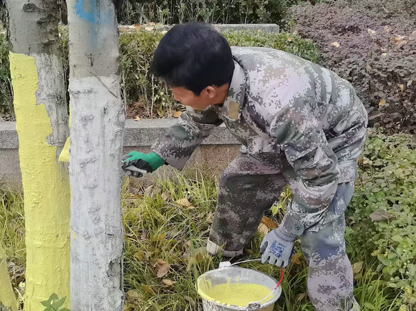 重慶合川訊(通訊員 湯英勇)隨著氣溫的逐漸下降,園林植物開(kāi)始進(jìn)入冬季生長(zhǎng)休眠期,為強(qiáng)化綠化植物養(yǎng)護(hù)管理,全力確保綠化植物安全越冬,近日,冬季樹(shù)木刷白防護(hù)工作全面啟動(dòng)。宜邦物業(yè)園林工作搶抓天氣晴好的有利時(shí)機(jī),對(duì)御龍灣小區(qū)內(nèi)所有的樹(shù)木進(jìn)行涂白防護(hù)。