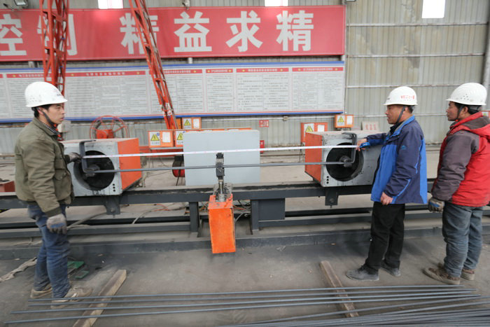 圖為技術(shù)人員檢查數(shù)控彎曲機加工鋼筋精度