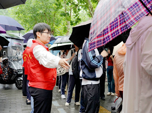 7日清晨,因雨水天氣,在社區(qū)的統(tǒng)一安排下,志愿者們迅速在學校門口搭建了應急愛心助力志愿服務點,為考生和等待的家長們提供遮風擋雨的地方,同時為考試和家長提供礦泉水、應急文具、休息板凳等。待考生進入考場后,志愿者主動邀請家長進入帳篷下避雨,與家長們聊及高考注意事項,緩解家長的焦慮心情。過程中,志愿者們積極協(xié)助太乙路辦事處維持考場外紀律秩序,文明引導行人和車輛停放秩序,全力保障考點周邊環(huán)境??荚嚱Y(jié)束,志愿者們?yōu)槲磾y帶手機的考生提供電話服務,幫助及時聯(lián)系家長,節(jié)約考生時間,做好充足午休,為下一場考試做好充分準備。青年志愿者們高度的責任感和熱情的服務態(tài)度,成為西安市鐵一中考場外一道亮麗的風景線。
