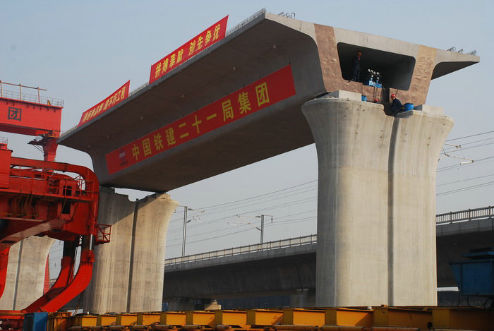 灞河特大橋澆筑無砟軌道 大西客專在設(shè)計和施工方面采用新技術(shù)、新材料和新工藝。使用900噸箱梁運架設(shè)備,采用具有中國自主知識產(chǎn)權(quán)的無碴軌道道床,應(yīng)用耐久性混凝土,運用先進的路基動態(tài)檢測技術(shù),確保速度目標(biāo)值高,安全舒適性好。