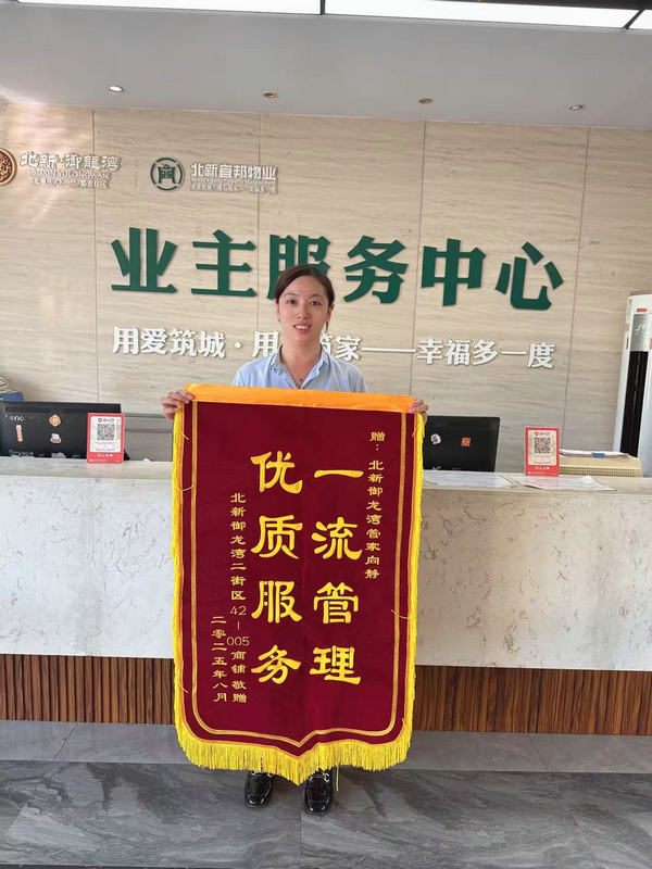 除了照料花草,寵物托管更顯服務(wù)溫度。二街區(qū)42棟一位餐飲業(yè)主避暑期間,家中小貓無人照料,樓棟管家向靜主動承擔(dān)起每日喂食、清理的任務(wù)。業(yè)主返家時,見愛寵活潑依舊,感動不已,2025年8月4日送來錦旗,用“一流管理,優(yōu)質(zhì)服務(wù)”的稱贊的對物業(yè)人表示了感謝和認(rèn)可。