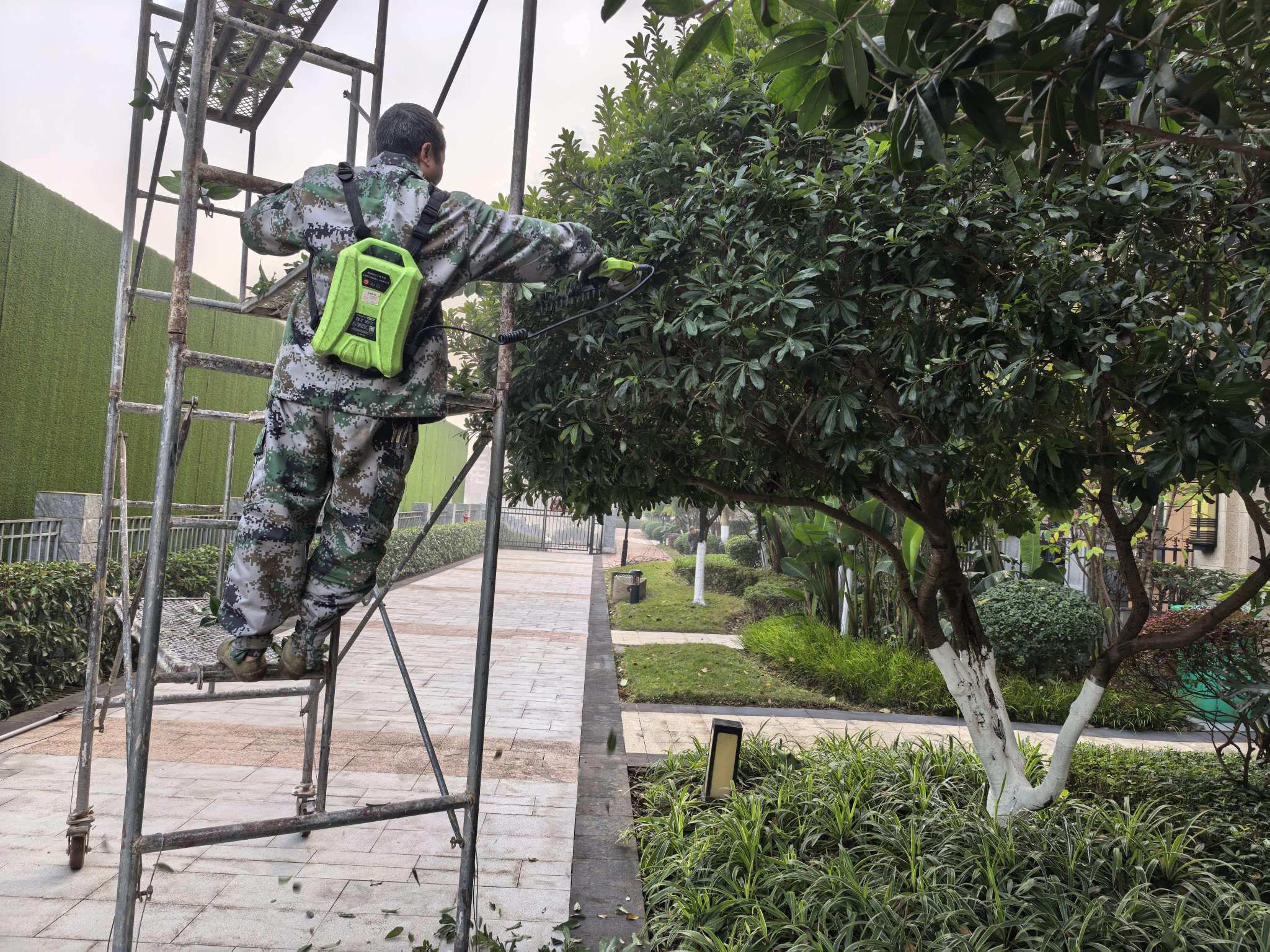在小區(qū)22棟旁的綠化區(qū)域,身著統(tǒng)一迷彩服的養(yǎng)護(hù)工作人員各司其職、默契配合,成為寒冬里最亮眼的風(fēng)景線。他們熟練搭建起金屬腳手架,背上亮綠色的電動工具包,手持高枝剪、修枝鋸等專業(yè)器械,重點對園區(qū)內(nèi)大型喬木、造型灌木及景觀桂花樹展開精細(xì)化修剪。站在數(shù)米高的腳手架上,工作人員穩(wěn)穩(wěn)托住枝干,目光專注地精準(zhǔn)剪除過密枝、徒長枝、病弱枝與枯萎枝,既為樹木調(diào)整出通風(fēng)透光的合理樹冠結(jié)構(gòu),又依據(jù)景觀需求塑造出整齊美觀的造型;地面上的同事同步跟進(jìn),迅速清理剪下的枯枝敗葉,分類打包、及時清運,確保作業(yè)區(qū)域環(huán)境整潔,杜絕枝葉堆積影響業(yè)主通行安全。