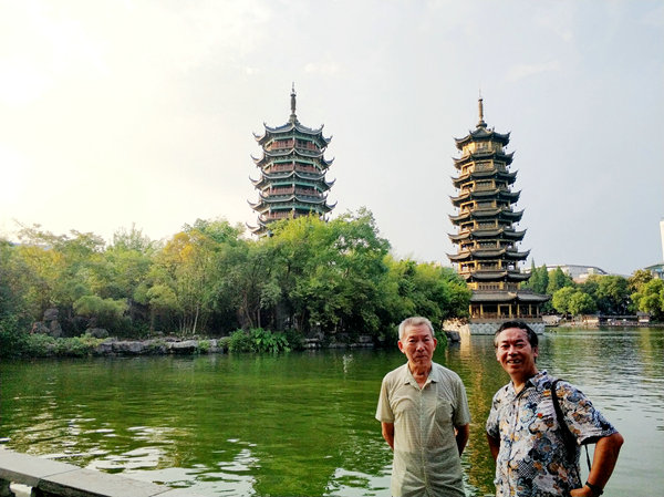 桂林石刻、七星巖拓林、世界上最大的駱駝、元風洞、普陀山、逍遙樓,莫老兵陪著我一路游覽;駐足于烈士紀念碑和陳光烈士紀念塔之下,忽然發(fā)現(xiàn)最危險的往往就是身邊最近的人,因為只有身邊最近的人出賣的信息才是最真實可靠而讓這些仁人志士被捕入獄,甚至獻出生命而就義;一路踏來,日月雙塔、榕湖、杉湖景色慢慢讓人流連于夜色降臨……
