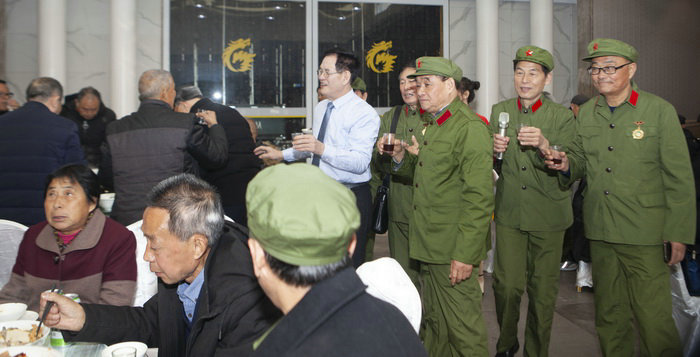 會(huì)務(wù)組領(lǐng)導(dǎo)向戰(zhàn)友們敬酒 12點(diǎn)20分,演出結(jié)束后,工作人員安排全體戰(zhàn)友及家屬在酒店用餐。會(huì)長(zhǎng)楊澤林、執(zhí)行會(huì)長(zhǎng)賀正海、副會(huì)長(zhǎng)楊德榮、副會(huì)長(zhǎng)汪正茂、秘書(shū)長(zhǎng)張永華等向全體戰(zhàn)友致祝酒詞并敬酒,祝賀參軍50周年慶典聯(lián)誼會(huì)取得圓滿成功!并希望戰(zhàn)友們保重身體,老有所樂(lè),愉快地生活,安享晚年!在熱烈的掌聲中,老戰(zhàn)友們舉杯歡慶,希望明天更美好!