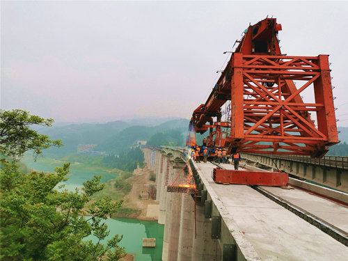 (通訊員 譚帥)4月4日,位于重慶涪陵區(qū)江東街道和白濤街道交界處的渝懷鐵路涪秀二線麻溪河右線特大橋施工現(xiàn)場(chǎng)霧氣彌漫,焊花四射,隨著最后一跨32米T梁的安全焊接完畢,標(biāo)志著該條鐵路自涪陵向秀山方向的首座特大橋順利實(shí)現(xiàn)貫通,并創(chuàng)下了在運(yùn)距過(guò)遠(yuǎn),橋隧相連地段單日架梁4孔的新紀(jì)錄。