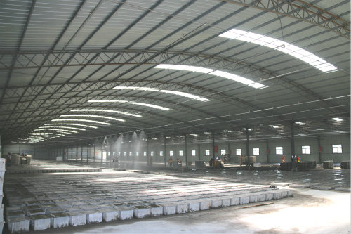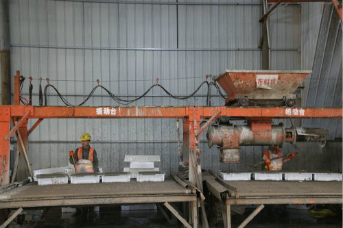 圖二、布料振搗 “咱們的小型預(yù)制件場(chǎng)通過一臺(tái)1000型拌合機(jī)和兩臺(tái)上行式軌道布料器,雙向同時(shí)給四個(gè)模具布料,大幅提高砼的入模速度;在四個(gè)大功率、大平臺(tái)組成的自行式振動(dòng)臺(tái)上,自動(dòng)滾軸式托盤與叉車配合生產(chǎn),模具的振搗和轉(zhuǎn)運(yùn)全部是機(jī)械自動(dòng)化,減少了10個(gè)人工,整個(gè)項(xiàng)目下來,能節(jié)約50多萬元的成本。”由維健自豪地向湯建偉繼續(xù)講解,“為了確保預(yù)制構(gòu)件的質(zhì)量,在養(yǎng)生環(huán)節(jié),咱們采用了全自動(dòng)信息化噴淋養(yǎng)生系統(tǒng),分區(qū)域、分階段對(duì)預(yù)制塊進(jìn)行養(yǎng)護(hù),更利用網(wǎng)絡(luò)和手機(jī)終端進(jìn)行實(shí)時(shí)監(jiān)控,杜絕了人為因素造成的養(yǎng)生不到位。使用過的模具集中到振動(dòng)臺(tái)旁邊的清洗池,統(tǒng)一清理后再布料振搗,整個(gè)流水線就這樣在場(chǎng)內(nèi)全部完成。”