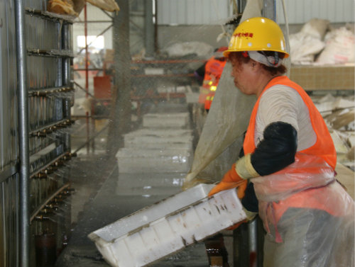 圖四、清洗模具 據(jù)悉,中國鐵建大橋局西北公司京藏改擴(kuò)建路面1標(biāo)小型預(yù)制件場(chǎng)的生產(chǎn)任務(wù)多達(dá)32556.69 立方米,132萬塊,主要為路面排水槽、空心六棱磚、實(shí)心六棱磚、拱形骨架、方格、護(hù)肩板,急流槽、縱向排水溝等。通過流水線施工作業(yè),日均生產(chǎn)量可達(dá)到90~100立方米,最多時(shí)可達(dá)到117立方米,比業(yè)主要求的日均生產(chǎn)量多了近40立方米。