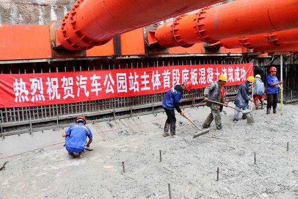 汽車公園站首段底板需要打入混凝土795m³,員工們發(fā)揚(yáng)鐵軍連續(xù)作戰(zhàn)的精神,他們冒著毛毛細(xì)雨晝夜奮戰(zhàn),經(jīng)過大伙20多個(gè)小時(shí)的頑強(qiáng)拼搏,終于圓滿完成了這項(xiàng)艱巨的任務(wù)。首段底板混凝土的澆筑成功,為下步其它各項(xiàng)工序的施工打下了堅(jiān)實(shí)的基礎(chǔ)。