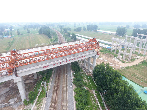 臺(tái)輝高速跨瓦日鐵路工程K110橋作為范臺(tái)梁高速公路的重要一環(huán),位于臺(tái)前縣后方鄉(xiāng)大寺郭村西北側(cè)、東王坊村南側(cè),瓦日鐵路范縣至臺(tái)前區(qū)間內(nèi),道路與鐵路交角65度,交叉處道路位于左偏圓曲線上,上部結(jié)構(gòu)采用50米先簡(jiǎn)支后連續(xù)預(yù)制T梁。自6月9日至7月2日,連續(xù)要Ⅱ級(jí)點(diǎn)16個(gè),過孔2次,安全完成T梁架設(shè)14片。