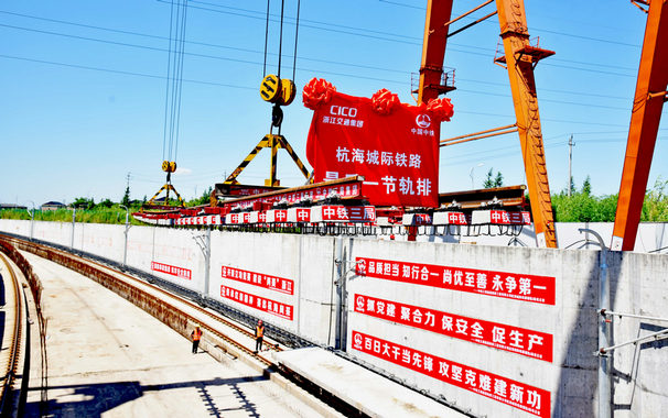 杭州至海寧城際鐵路,又稱杭州地鐵海寧線,沿線經(jīng)過了杭州市余杭區(qū)(南苑街道)、許村鎮(zhèn)、長安鎮(zhèn)、周王廟鎮(zhèn)、鹽官鎮(zhèn)、斜橋鎮(zhèn)、海寧主城區(qū),線路總長約48.18千米,共設站13座。杭海城際鐵路的建成對發(fā)揮都市圈同城效應,打造融杭"一小時通勤圈",推動城鎮(zhèn)一體化發(fā)展,構(gòu)建"立體式"綜合交通走廊起到重要作用。中鐵三局線橋公司承擔34.56千米鋪軌任務及相關工程,橫跨余杭高鐵站至長安鎮(zhèn)站3站2區(qū)間,設海長區(qū)間置U型槽和余許區(qū)間2處鋪軌基地,