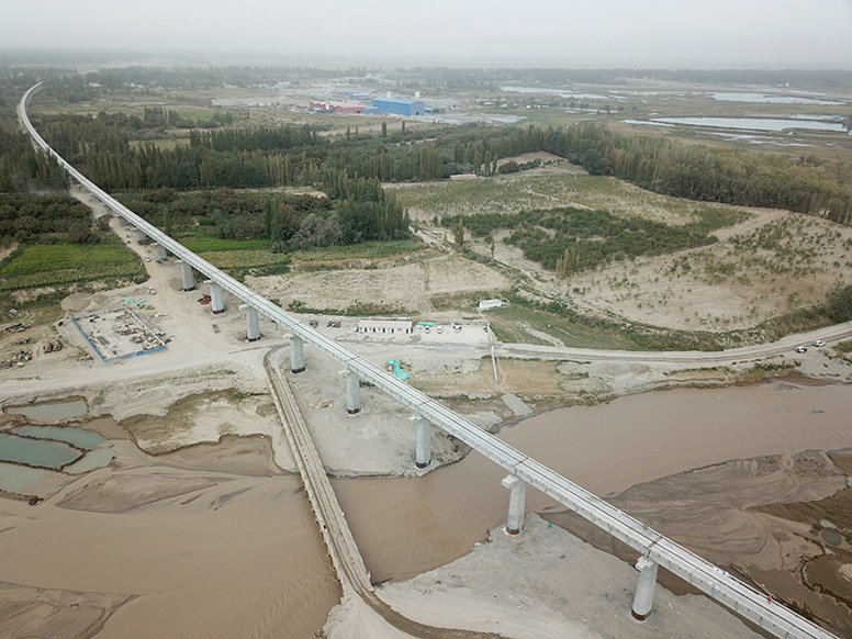 圖為車兒臣河特大橋新建和田至若羌鐵路S5標(biāo)位于新疆巴音郭楞蒙古自治州境內(nèi),經(jīng)過且末縣及新疆生產(chǎn)建設(shè)兵團(tuán)。線路沿昆侖山北麓的山前洪積平原和塔克拉瑪干沙漠南緣與G315國道并行自東向西延伸,是南疆通往內(nèi)地又一便捷通道的重要組成部分。