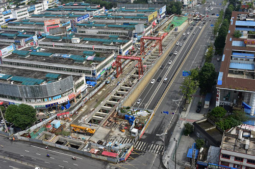 金府站為成都地鐵6號(hào)線一、二期工程中間車(chē)站,與遠(yuǎn)期規(guī)劃的地鐵27號(hào)線節(jié)點(diǎn)換乘,車(chē)站位于交大路與金府路交叉路口東南側(cè),小里端橫跨金府路口,沿交大路出城方向輔道呈南北向布置。車(chē)站兩端頭均為盾構(gòu)接收井。共設(shè)4個(gè)出入口和兩組風(fēng)亭,主體基坑長(zhǎng)311.3m,標(biāo)準(zhǔn)段寬20.4m,北端側(cè)擴(kuò)大端寬24.4m,南側(cè)擴(kuò)大端寬24.85m,基坑挖深20.6m至22.65m。主體結(jié)構(gòu)標(biāo)準(zhǔn)段為地下兩層雙跨結(jié)構(gòu),局部為拱形頂板單跨結(jié)構(gòu)(136m)。車(chē)站采用敞口、全蓋、半蓋結(jié)合設(shè)計(jì),半蓋挖法施工,其中跨金府路路口為全蓋施工?;訃o(hù)結(jié)構(gòu)采用鉆孔灌注樁+混凝土支撐+鋼支撐支撐體系,主體結(jié)構(gòu)為現(xiàn)澆鋼筋混凝土結(jié)構(gòu)。