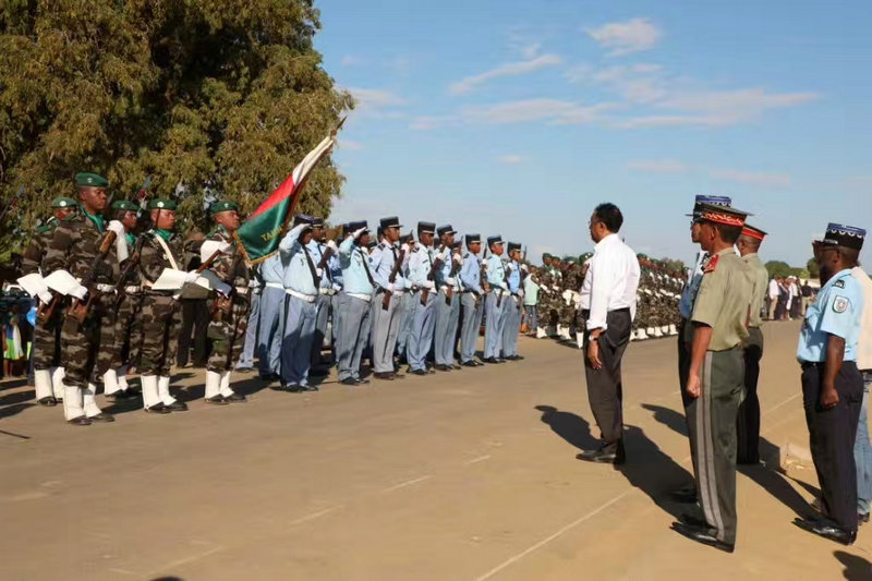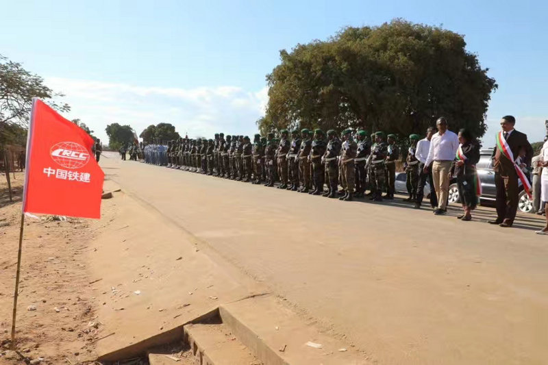 馬達(dá)加斯加三軍儀仗隊在中鐵十八局集團(tuán)承建的九號公路上列隊等待總統(tǒng)的檢閱