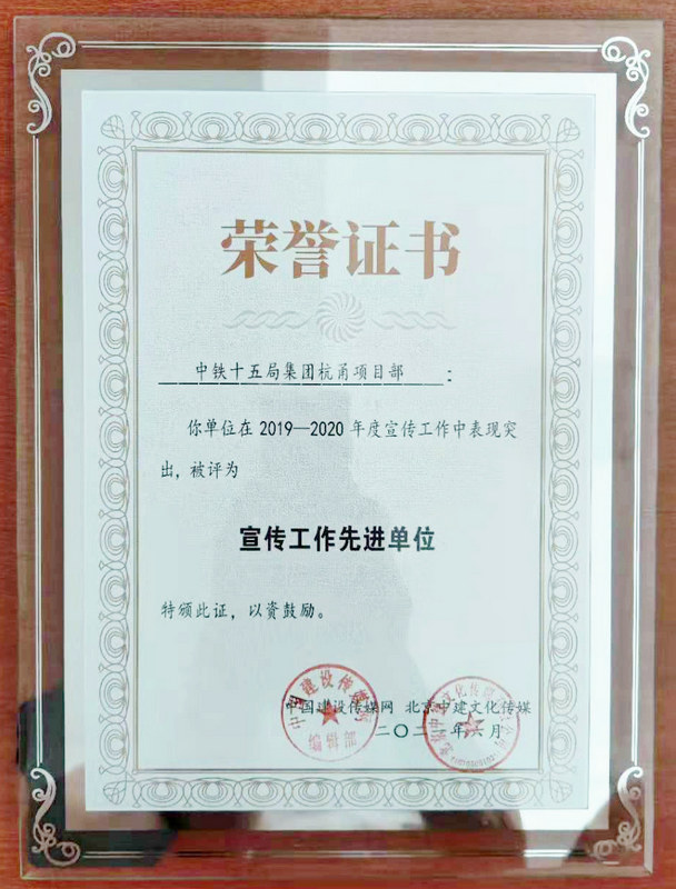 鐵路工程建設(shè)網(wǎng)訊(特約通訊員呂奎元 通訊員祁寒)日前,中國建設(shè)傳媒網(wǎng)在天津國家會展中心召開新聞宣傳表彰大會,表彰先進(jìn)單位和先進(jìn)個人,中鐵十五局集團(tuán)杭甬項目部榮獲2019年—2020年度宣傳工作先進(jìn)單位稱號。