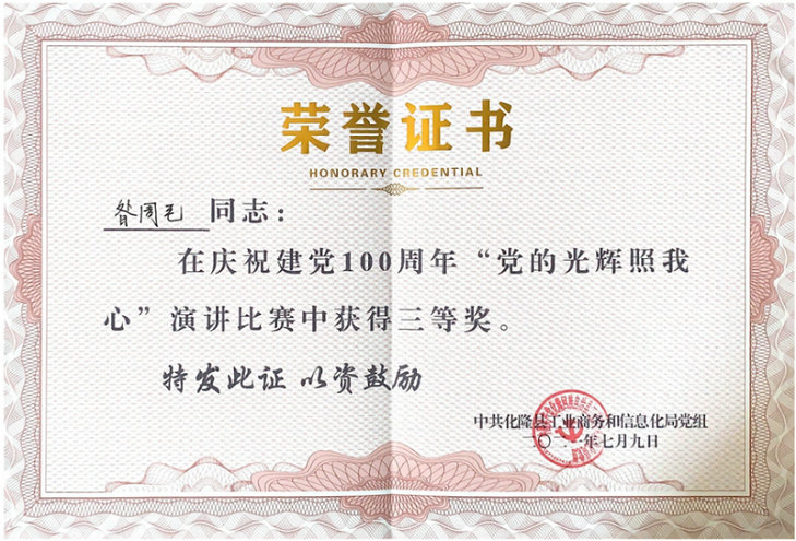 近日,中鐵二十一局四公司青海分公司化隆砂石廠受邀參加化隆縣工業(yè)商務(wù)和信息化局黨組慶祝建黨100周年“黨的光輝照我心”演講比賽,參賽代表榮獲三等獎。