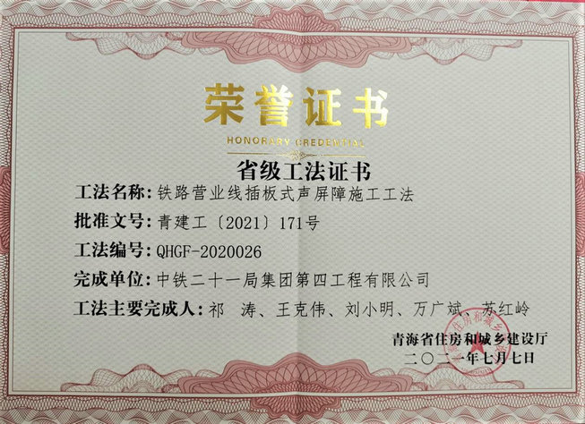 近日,從青海省住房和城鄉(xiāng)建設(shè)廳傳來捷報(bào),中鐵二十一局四公司酒額鐵路工程項(xiàng)目部自主研發(fā)的《鐵路營業(yè)線插板式聲屏障施工工法》獲得青海省省級(jí)施工工法。該工法在其公司承建的干武二線工程與酒額鐵路工程中均得到了有效實(shí)踐,效果顯著,為今后同類施工提供了參考經(jīng)驗(yàn)。