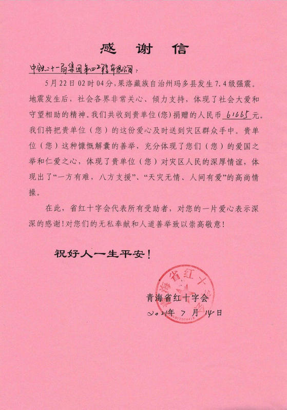 日前,中鐵二十一局四公司收到了青海省紅十字會(huì)發(fā)來(lái)的感謝信,對(duì)該公司在青?,敹?·22地震中心系災(zāi)區(qū)人民,在抗震救災(zāi)中給予的有力支持和幫助表示感謝,對(duì)該公司全體干部職工的無(wú)私奉獻(xiàn)和人道善舉致以崇高的敬意。