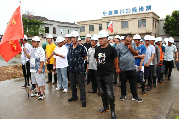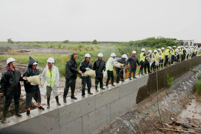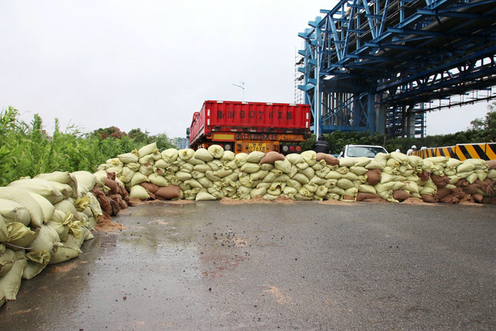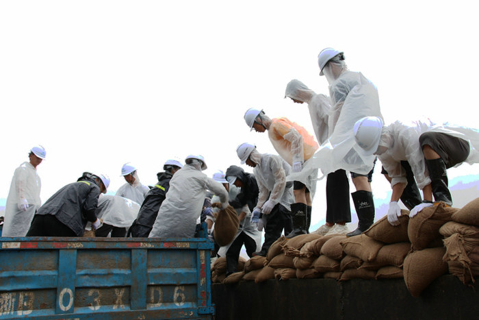 23日,杭甬項(xiàng)目部接到寧波市鎮(zhèn)海區(qū)和杭甬復(fù)線寧波一期高速公路有限公司防臺(tái)風(fēng)搶險(xiǎn)加固海堤的緊急任務(wù)后,立即組建了一支200人的搶險(xiǎn)隊(duì)伍,并購置了雨鞋、雨衣、安全帽、礦泉水等一批搶險(xiǎn)物資,為完成好寧波市鎮(zhèn)海區(qū)抗臺(tái)風(fēng)加固海堤搶險(xiǎn)任務(wù)作了組織上和物資上的準(zhǔn)備。24日上午10點(diǎn),該項(xiàng)目部班子成員冒著狂風(fēng)暴雨帶領(lǐng)搶險(xiǎn)人員兵分三路,一路人馬在一個(gè)砂石料場(chǎng)裝沙袋,另兩路人馬開赴位于臨近石化區(qū)域的兩處海堤位置往堤壩上堆碼沙袋。裝沙袋的一路人馬,兩人一組,一個(gè)人張開蛇皮袋口子,一個(gè)人快速地將一鍬鍬沙子裝進(jìn)袋子里,裝好一袋,合力扔到車上,風(fēng)越刮越大,大雨如注,干活的人卻一刻也不停。員工們?cè)谥挥?0厘米寬、約2米高的海堤上堆碼沙袋,稍不留神會(huì)掉進(jìn)淤泥形成的沼澤里。大風(fēng)吹開了他們胸前的雨衣扣,雨水直接飄到衣服上,誰也顧不上理會(huì),只為早點(diǎn)將低矮的堤壩加高,抵御臺(tái)風(fēng)掀起的大潮,使化工區(qū)免遭洪澇災(zāi)害。