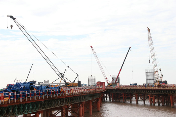 為了員工的安全,27日上午,公司副總工程師兼杭甬項目負(fù)責(zé)人黃偉帶領(lǐng)有關(guān)人員對濱海高架橋和濱?;ネㄗ屑?xì)檢查一遍,確認(rèn)具備復(fù)工條件。下午2點多,組織各施工隊伍進場,棧橋、樁基、承臺、墩身、鋼筋籠加工等各工序作業(yè)全面恢復(fù)。