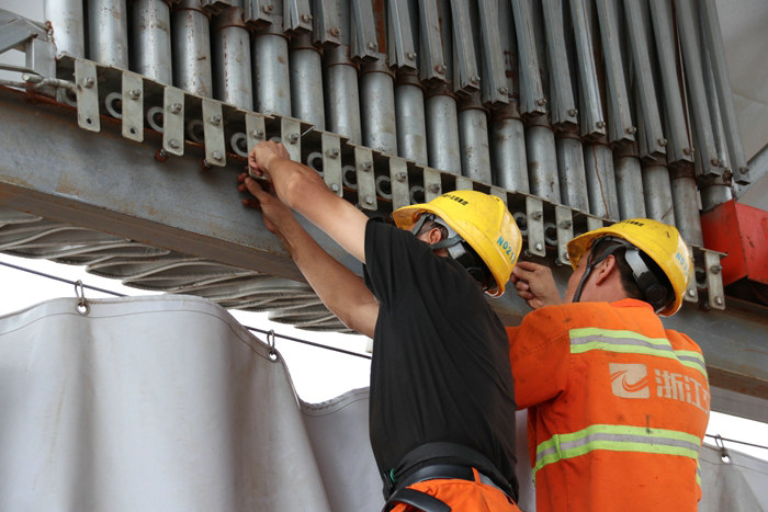 根據(jù)業(yè)主要求和確保員工生命和企業(yè)財產(chǎn)安全,6號臺風(fēng)“煙花”襲擊寧波前后的22日——27日上午,在工期緊、任務(wù)重的情況下,杭甬項目被迫停工,面臨肆虐的臺風(fēng),不能迎面碰撞,只能采取迂回的戰(zhàn)術(shù)與其“斗智斗勇”,一場沒有退路的硬仗不可避免。在臺風(fēng)到來前用繩索加固 “大臨”58棟集裝箱和轉(zhuǎn)瓦房,拆除工地上、“大臨”幾百塊宣傳牌、標(biāo)識牌,將小型車倆和設(shè)備轉(zhuǎn)移至安全地帶,將30多臺大型汽車起重吊、履帶吊的大臂安全落地。同時將在位的965名員工安置到鎮(zhèn)海區(qū)的多家賓館酒店、禮堂,還要保障他們的安全和生活,期間還組織200人的隊伍冒著如注的暴雨、猛烈的狂風(fēng),參加位于寧波鎮(zhèn)海化工區(qū)的海堤加固,支援地方搶險救災(zāi)。該項目部主要領(lǐng)導(dǎo)的神經(jīng)始終繃得很緊,在臺風(fēng)來襲前后大量的工作在短時間內(nèi)必須做好。黨員干部沒有一個退縮,哪一樣都不能疏忽,保證員工的生命安全是頭等大事。嚴(yán)管與善待相結(jié)合,環(huán)環(huán)相扣。所幸臺風(fēng)只在數(shù)十公里外的舟山盤旋了數(shù)小時后出境北移,寧波安全了,杭甬項目也免受12——14級大風(fēng)的傷害。臺風(fēng)波及面寬,寧波的風(fēng)力達到8—9級,連續(xù)大到暴雨天氣,市內(nèi)多處積水半米多深。臺風(fēng)過后,風(fēng)雨都減弱了,亟待恢復(fù)生產(chǎn)。