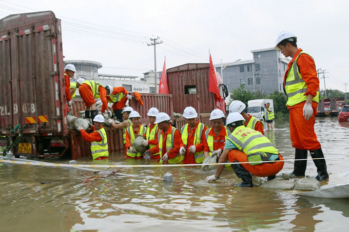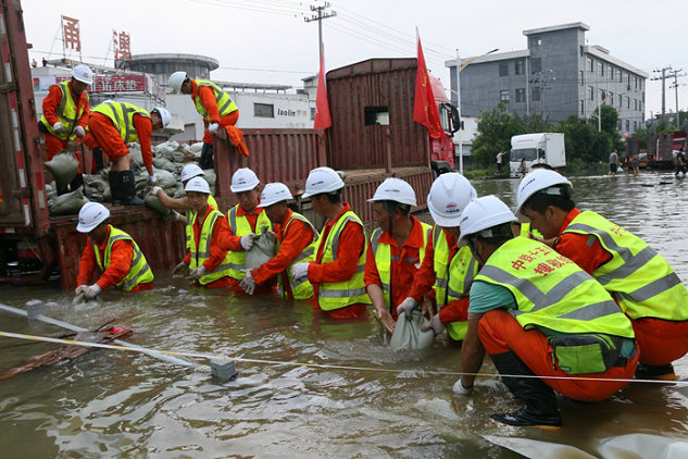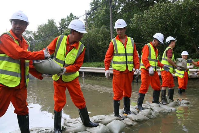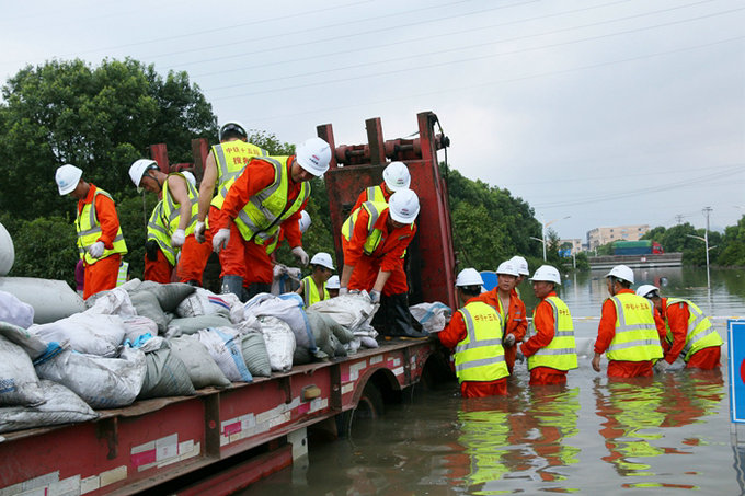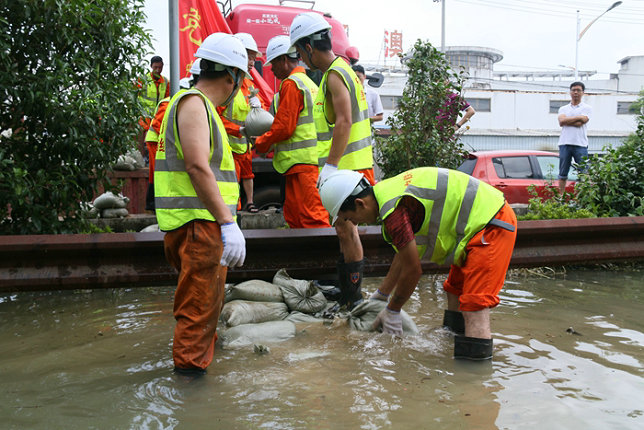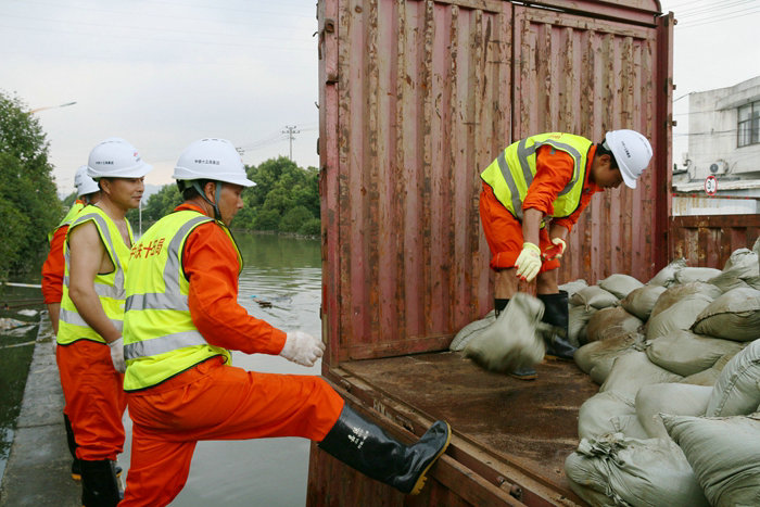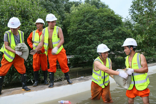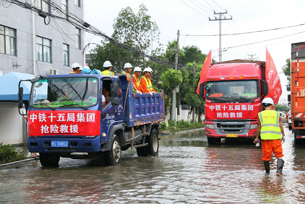 28日清晨,杭甬項目部接到寧波市防洪防汛指揮部的指令:中鐵十五局馬上組織搶險隊伍到寧波海曙區(qū)古林鎮(zhèn)搶險救災!古林鎮(zhèn)地勢較低,受臺風暴雨影響,海水倒灌,全鎮(zhèn)9條四通八達的道路被淹、上萬間房屋底樓和多家工廠積水20—50厘米,位于鄞縣大道與機場路交叉的凈高6米的洞橋(立交),被海水淹沒,車輛和行人無法通行,全鎮(zhèn)多個村莊和工廠斷水斷電,嚴重影響了古林鎮(zhèn)村民的生活和生產。險情就是命令!該項目部迅速派出一支40人的搶險隊,出動8輛貨車、小車直奔受災的鄞縣古林。鄞縣大道有3處路面積水需要用沙堤阻斷,并將涌水口堵住。