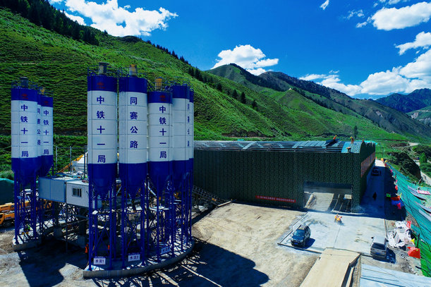 青山腳下的拌和站、料倉(cāng)