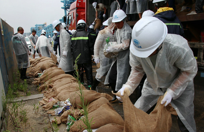 裝沙袋的將士,兩人一組,一個人張蛇皮袋口子,一個人快速地將一鍬鍬沙子往袋子里裝,裝好一袋,合力抬到車上。大堤上的人馬迎著風雨卸車、堆碼沙袋。風越刮越大,大雨如注,干活的人卻一刻也不停。搶險隊員們在只有50厘米寬、約2米高的海堤上作業(yè),稍不留神會掉進沼澤里。大風吹開了他們胸前的雨衣扣,雨水直接澆到衣服上,遭雨淋不要緊,吃點苦沒啥,大家目的很明確,齊心協(xié)力將低矮堤壩加高,抵御臺風大潮,使化工區(qū)免遭洪澇災害。午飯不能回家吃,員工在風雨里就餐。飯后,各路人馬繼續(xù)按照事先的分工爭分奪秒地加固堤壩。下午四點,分力達到8級以上,風雨交加,密集的雨點打在員工臉上很疼,眼睛被雨水浸的睜不開,卻沒有一個人退縮或少干,他們心往一處想,勁往一處使,把搶險當成一項神圣的任務來完成。直到晚上7點,連續(xù)奮戰(zhàn)10個小時,在紅旗渠、海塘堤壩地段堆碼沙袋20000多袋,長1.5公里,圓滿完成了加固堤壩搶險任務。