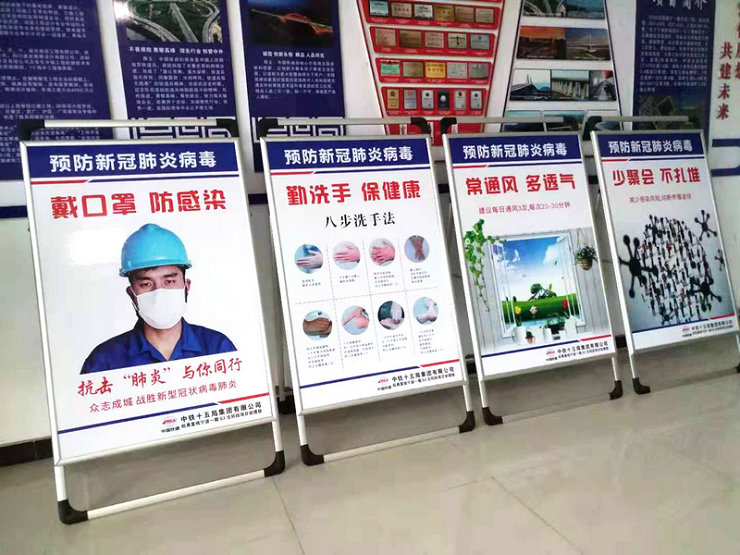 其次,在項(xiàng)目部、施工現(xiàn)場(chǎng)張貼、懸掛新冠肺炎防控宣傳畫(huà)和標(biāo)語(yǔ),并利用會(huì)議等形式對(duì)員工進(jìn)行疫情防范教育,使大家養(yǎng)成勤洗手、愛(ài)干凈習(xí)慣,從思想上、行動(dòng)上引起足夠重視,同心協(xié)力打一場(chǎng)新冠疫情防疫仗,確保一方平安。
