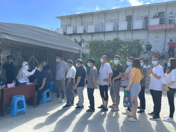 圖為員工排隊檢測 經(jīng)過兩個多小時緊張有序核酸采樣,共完成對全線400余名參建員工核酸檢測樣本采集,實現(xiàn)100%核酸檢測全覆蓋。
