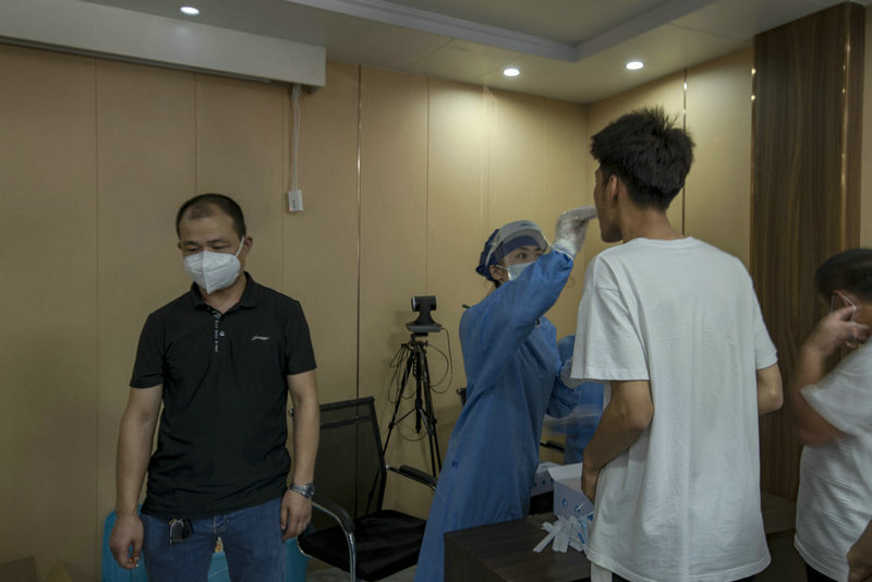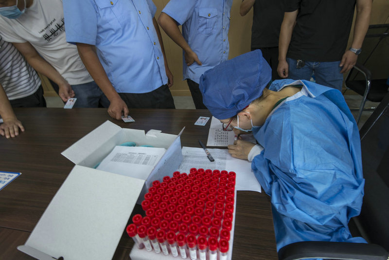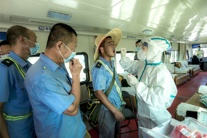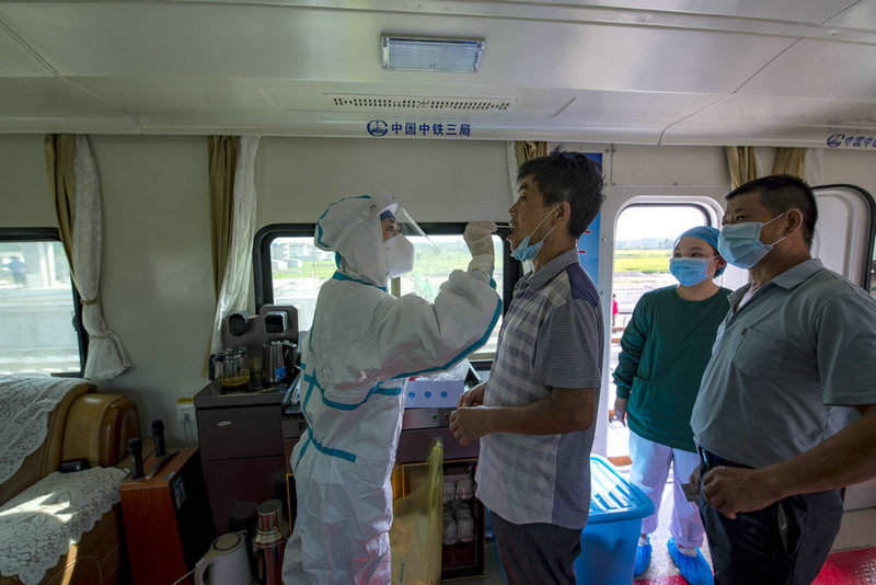 中鐵三局線橋公司黃黃鐵路項(xiàng)目浠水鋪軌基地醫(yī)務(wù)工作者正在進(jìn)行核酸檢測因子取樣