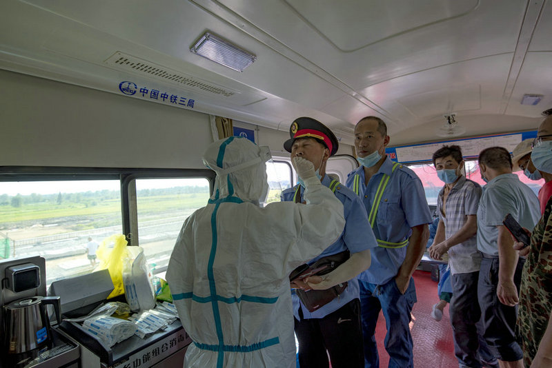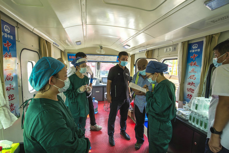 中鐵三局線橋公司黃黃鐵路項(xiàng)目浠水鋪軌基地醫(yī)務(wù)工作者正在進(jìn)行身份信息登記