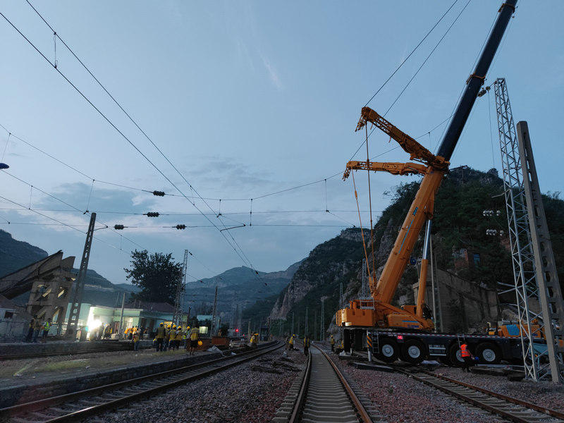后寨車站上跨橋梁是是上世紀(jì)七十年代修建的人行天橋,跨越車站共五條股道?,F(xiàn)因橋體病害嚴(yán)重已廢棄,但高懸在太焦鐵路線上,對(duì)行車安全造成重大威脅。中原公司接到拆橋任務(wù)后,公司各級(jí)精心組織焦作項(xiàng)目部和設(shè)計(jì)、各配合單位精誠(chéng)合作,攻堅(jiān)克難。面對(duì)疫情防控、汛期施工、地理環(huán)境復(fù)雜等不利因素,在危橋拆除與山體危石爆破交叉施工的不利情況下,項(xiàng)目部強(qiáng)化組織,各部門通力合作,晝夜不懈奮戰(zhàn),從勘察現(xiàn)場(chǎng)、編制報(bào)批方案、拆除接觸網(wǎng)、拆除破碎危橋、接觸網(wǎng)恢復(fù)到線路開通僅用9天時(shí)間,做到了施工文明、質(zhì)量達(dá)標(biāo)、安全可控,體現(xiàn)了中原鐵軍的擔(dān)當(dāng)。