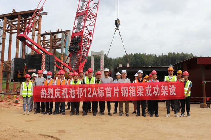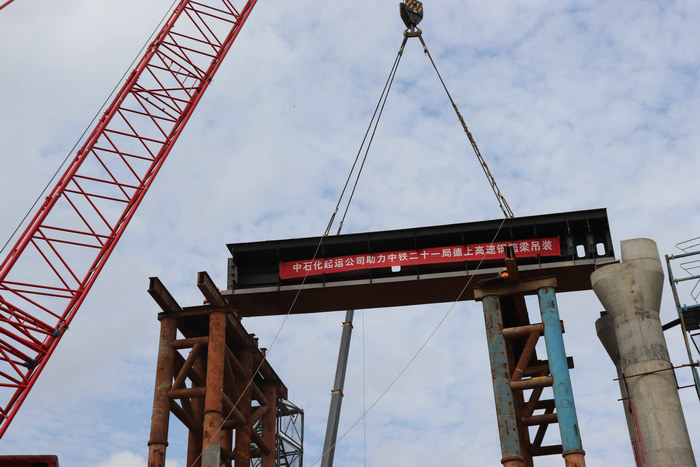 圖為鋼箱梁吊裝施工該樞紐匝道橋橫跨祁黃高速公路,均分布于河灘低洼地段,地質松軟,最大墩高23.8m,基礎施工難度大、安全風險高。為確保吊裝架設安全,達到工藝要求,有效實現(xiàn)鋼箱梁平穩(wěn)架設,項目部組織工程技術人員召開首件鋼箱梁架設專題會,超前謀劃,周密部署,制定切實可行的架設施工方案,完善施工工藝預案和技術交底,采取吊裝預案演示,確保各工序銜接緊湊,協(xié)調高效和后續(xù)架設施工順利推進。