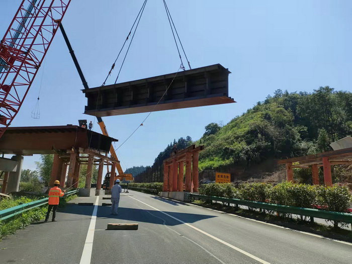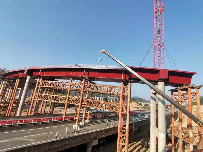 圖為鋼箱梁跨越黃祁高速 在匝道橋施工量大、工期緊、節(jié)點(diǎn)任務(wù)重的情況下,項(xiàng)目部結(jié)合焊接工藝、吊裝架設(shè)質(zhì)量要求的特點(diǎn)成立鋼箱梁安裝值班領(lǐng)導(dǎo)小組,配備專(zhuān)職安全員和現(xiàn)場(chǎng)技術(shù)人員,精心編制施工方案,嚴(yán)格監(jiān)管現(xiàn)場(chǎng)吊裝操作規(guī)范化,值班技術(shù)人員現(xiàn)場(chǎng)盯控和跟蹤吊裝質(zhì)量過(guò)程,按“三位一體”質(zhì)量保證體系組織實(shí)施,采用新技術(shù)、新工藝、新方法、新材料規(guī)范化施工,使匝道鋼箱梁吊裝得以有序推進(jìn)。