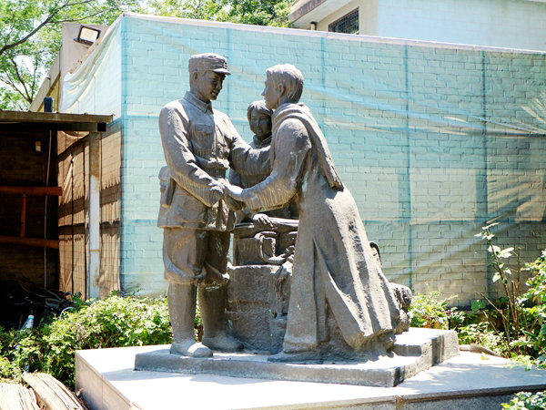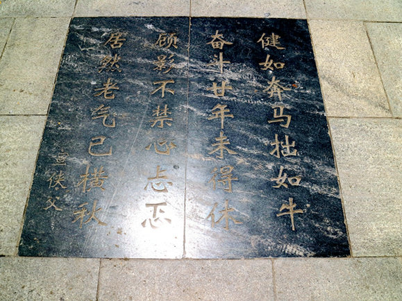 我們?nèi)サ哪翘欤檬前艘唤ㄜ娋攀闹苣?。這天,雖然第二、四、五、七號(hào)等院的外門(mén)未開(kāi),但里面相通。在院門(mén)外的廣場(chǎng)地面上有宣俠父生前曾在自己的照片背面寫(xiě)下一首詩(shī)的碑刻,即:“健如奔馬拙如牛,奮斗廿年未得休。顧影不禁心忐忑,居然老氣已橫秋。”說(shuō)明在抗日戰(zhàn)爭(zhēng)進(jìn)入白熾化之際,這位才華橫溢的高級(jí)參議,沒(méi)有死在抗日的戰(zhàn)場(chǎng)上,卻遺憾地倒在了國(guó)民黨特務(wù)的毒手之下。廣場(chǎng)一偶,還有一尊人物造型的石雕。