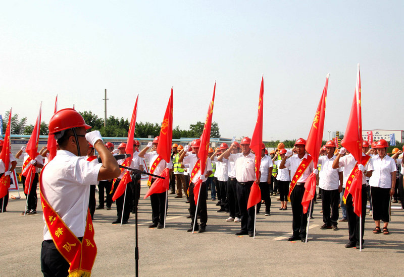 儀式上,與會領導向項目部“黨員先鋒”隊和“青年突擊”隊授旗;建安公司西安建筑分公司黨總支書記屈新升宣讀倡議書,項目部“黨員先鋒隊”代表李百贏帶領全體隊員莊嚴宣誓。