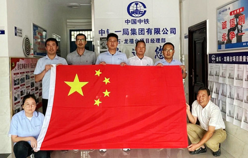 10月1日早晨8:00,各項目部早早就將提前準備好的五星紅旗拿了出來,在旗手的護送下,伴隨著慷慨激昂的國歌,五星紅旗與10月1日早晨的朝陽一同升起,國旗在湛藍的天空中迎風飄揚,顯得格外鮮艷。
