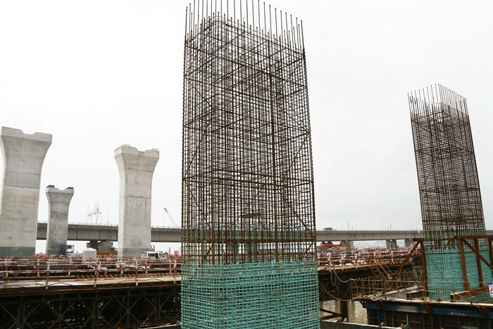濱海互通立交設計為變形苜蓿葉形互通型式,最小曲線半徑 60米,ABCD 匝道設計時速60公里,EFGH 匝道設計時速 40公里,最大縱坡 3.82%。主線2.4公里,8座匝道橋全長 5.9577公里,4 座拼寬橋1.32公里。該橋下部結構為474 根鉆孔樁,平均樁長約 90 米。橋墩634座,其中柱式墩身207 座,墩高 6.9—25.5米。8 米以上的墩柱設有系梁,匝道交匯處和拼寬橋設有蓋梁。