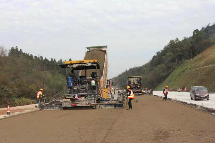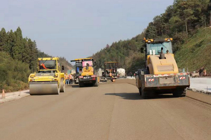 圖為攤鋪水穩(wěn)層 由中鐵二十一局三公司承建的池祁高速12A標(biāo),主要工程為路基橋涵施工,路基占標(biāo)段總長的三分之二,由于線路布設(shè)在陡峭的山坡,與鄉(xiāng)道、高鐵交叉,并跨越河流低洼地帶,還面對高壓改線等拆遷難題,加之地質(zhì)松軟,安全風(fēng)險高,施工生產(chǎn)面臨巨大挑戰(zhàn),給施工帶來一定難度。按照倒排工期,為盡快投入施工,在前期籌備過程中,從組建水穩(wěn)料拌合站到料源組織把工作往前趕,自產(chǎn)水穩(wěn)石料快馬加鞭日夜不停生產(chǎn),以滿足路基水穩(wěn)攤鋪需求。同時對成型路基采取合格一段驗交一段,確保驗交、攤鋪兩不誤。通過全方位加大施工投入,優(yōu)化施工工序和人員包保責(zé)任人制舉措,使路基水穩(wěn)攤鋪施工有序快速推進(jìn),保證了路基水穩(wěn)攤鋪壓實質(zhì)量。