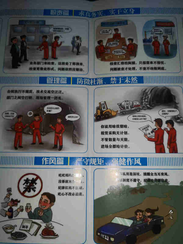 如何更有效地警示和杜絕基層一線項目部工作中的不良作風?中鐵十八局隧道公司紀委以黨史學習教育為契機,積極開展“樹信念爭先鋒,守紀律鑄忠誠”弘揚優(yōu)良傳統(tǒng)和作風活動,在對黨員干部集中進行作風教育整頓的同時,利用漫畫集的形式,從公司實際出發(fā),把項目部在職責履行、項目管理、工作過程、廉潔從業(yè)等方面,普遍存在的不擔當不作為、不認真不嚴謹、不規(guī)矩不規(guī)范等24種不良的現(xiàn)實表現(xiàn),比如:“前后部長不交接,臺賬資料亂糟糟。我到任時建新帳,管他舊賬是啥樣。”“考勤打卡不嚴肅,你提單來我就批。大家都做老好人,管你合規(guī)不合規(guī)。”“特產滿含‘情義’重,你送我送樂融融。發(fā)現(xiàn)問題難開口,怎能指導去督促。”“一點一滴,我之名節(jié)。一厘一毫,國之資產”等等現(xiàn)象,以漫畫的方式制作成小冊子,下發(fā)到全體干部員工手上,這種折疊式的小冊子,方便攜帶,并有漫畫和提示語,生動形象、引人入勝,又便于記憶,深受大家喜愛,也促使大家記憶深刻,從而警示教育黨員干部“不做案中人,不做案中事”,自覺講規(guī)矩守紀律,廉潔從業(yè),擔當作為,切實起到帶頭表率作用。