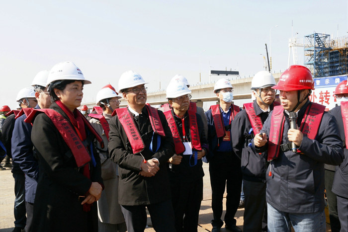 上午10點,余紅藝一行50多人乘3輛中巴到達位于濱?;ネ⒔荒蟼?cè)的施工現(xiàn)場,在一塊10米長的巨幅宣傳牌前,聽取寧波市交通局副局長樊獻鵬關(guān)于杭甬項目情況匯報。樊獻鵬手握話筒一會兒指著制作的兩張高速公路網(wǎng)圖和濱?;ネㄈ皥D,一會兒面向各位領(lǐng)導(dǎo),就杭甬復(fù)線寧波一期高速公路建設(shè),對改善杭州灣區(qū)域路網(wǎng)結(jié)構(gòu)、推進環(huán)杭州灣區(qū)建設(shè)、打造寧波舟山港集疏運網(wǎng)絡(luò)北向主要貨運通道、加強寧波舟山港集疏運能力、促進長三角一體化和沿海經(jīng)濟社會高質(zhì)量發(fā)展具有重要意義等作了詳細介紹。然后,他將杭甬項目濱?;ネㄖ攸c作了介紹。他說,中鐵十五局承建的濱?;ネㄕ己C娣e613畝,保守地說是亞洲最大的海上互通立交,據(jù)查證,目前世界上還沒有比濱?;ネǜ蟮暮I狭⒔?,施工難度大,技術(shù)含量高,安全風險大。這個項目前期因為多種原因,進度有點滯后,現(xiàn)在趕上來了,按期完成建設(shè)任務(wù)沒問題。隨后,余紅藝一行在F匝道查看了樁基施工情況。她指出,濱海互通是浙江省和寧波市的重點建設(shè)項目,百年大計,質(zhì)量必須要保證。安全也要注意,冬天來了,氣溫大幅下降,高空和夜間作業(yè),大風天氣要做好安全防護工作,確保施工人員安全。
