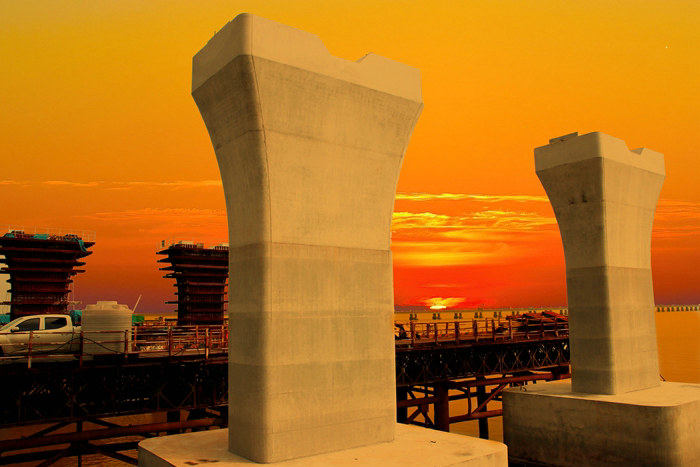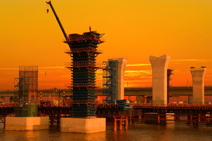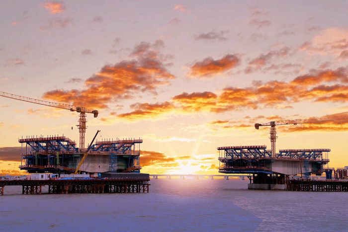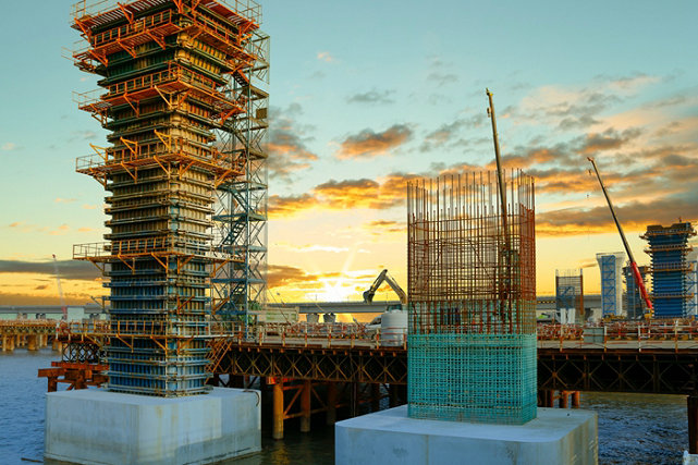 為了高效優(yōu)質(zhì)、安全地完成建設(shè)任務(wù),項目部選用20多支優(yōu)秀施工隊伍和供應(yīng)及時的材料供應(yīng)商。同時云集了100多臺大中型設(shè)備,在兩座大橋上掀起大干熱潮。廣大員工戰(zhàn)臺風(fēng)、冒酷暑、斗嚴(yán)寒,與時間賽跑,克服難以想象的各種困難,經(jīng)過不懈努力,截止今年11月中旬,累計完成鋼棧橋13000多米,濱海高架橋安全跨越水下17條管線,鋼棧橋成功下穿金塘大橋,濱海高架主體工程完工指日可待,濱海樞紐立交棧橋、樁基、承臺、橋墩施工如火如荼,鋼混組合梁已經(jīng)投產(chǎn),第一片梁即將加工制作成功,截止2021年10月,該項目完成產(chǎn)值14.34億元,占合同總額的66.55%,今年業(yè)主給下達(dá)8.4億元產(chǎn)值計劃,如期完成勝券在握。