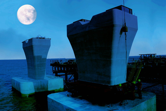 該公司承建的杭甬復(fù)線濱海高架橋和亞洲最大的海上互通濱海樞紐,全長14.9公里,設(shè)計樁基總量1745根172225延米,最長樁111.4米,最短樁74米,樁徑1.8—2.5米。橋梁承臺348座,大多數(shù)為矩形狀,少量為H型,主線和匝道均為高樁承臺,金塘拼寬橋為埋設(shè)承臺。兩座橋墩身810座,其中主線橋墩和拼寬橋為片式花瓶墩,8座匝道橋為圓柱墩+系梁,墩身設(shè)計634座,最高墩25.25米,最低6米,鋼混組合梁230孔,混凝土總量68.2萬立方,鋼筋7.265萬噸,鋼箱梁2.4萬噸,最重單塊梁體1700多噸。該標(biāo)段暫定合同金額21.547億元。2018年8月8日簽訂下部結(jié)構(gòu)合同,2019年8月正式開工。