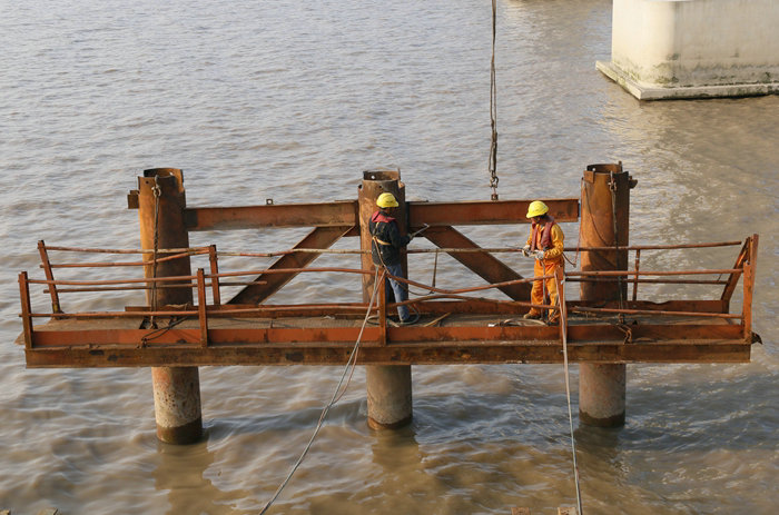 為此,從今年9月份起,該項目部組織棧橋隊進行破拆濱海高架28—53墩位置的1200米鋼棧橋,因部分墩身尚未移交,目前只拆除550米,現(xiàn)已拆除46跨棧橋。在拆除過程中,該項目部嚴格按照高空、水上作業(yè)安全操作規(guī)程做好安全工作,由專職安全員全程跟蹤,規(guī)范作業(yè)人員的行為,對履帶吊司機和參與破拆的電焊工,堅持做到崗前警示、施工中檢查指導,發(fā)現(xiàn)嫌麻煩不拴保險繩者,立即糾正,事后提出嚴厲批評,堅決杜絕類似不安全苗頭的發(fā)生。