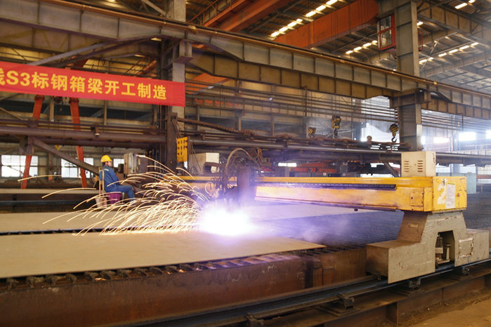 互通區(qū)匝道橋梁均采用鋼-混凝土組合梁。組合梁為槽口型結(jié)構(gòu),頂板寬0.6米、0.8米,底板寬2.1米、2.6米和3.1米,鋼梁高有1.2米(20米跨徑)、1.4米(25-31米跨徑)、1.7米(40米、42米跨徑)、1.9米(45米跨徑)和 2.1米多道豎向加勁肋,不同厚度的頂板、底板、腹板對(duì)接,頂板、底板頂面對(duì)齊,腹板中心對(duì)齊。每個(gè)組合梁均為單室截面,鋼箱之間采用工字型鋼橫梁聯(lián)系,橫梁與鋼梁內(nèi)橫隔板對(duì)應(yīng)設(shè)置,鋼梁頂板上焊接抗剪用的圓柱頭剪力釘。鋼箱梁是S3標(biāo)施工的重難點(diǎn)。