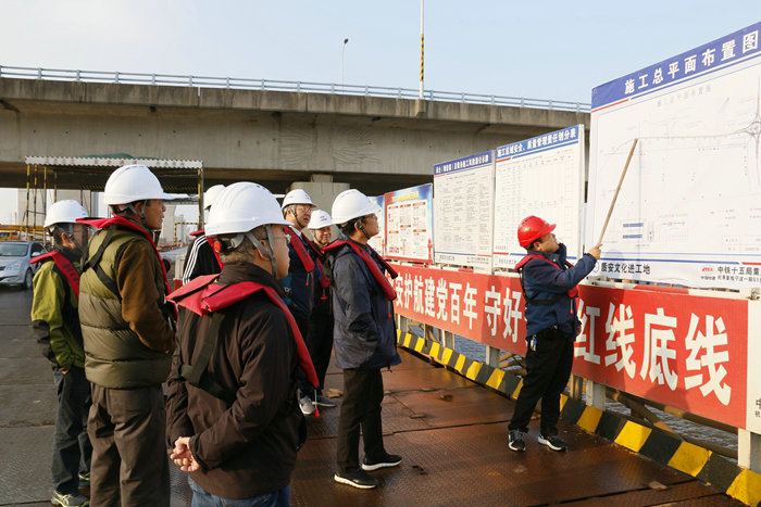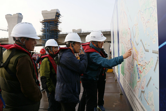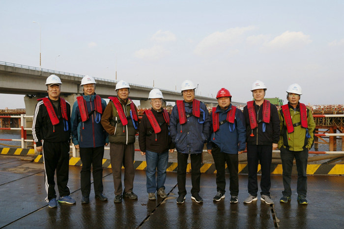 王勇一行5人從標(biāo)頭查看了猶如巨龍出海的濱海高架橋整齊地排列在海面上的176座橋墩和即將合攏的連續(xù)梁,然后驅(qū)車來到濱?;ネê诵膮^(qū)域考察。公司副總工程師兼杭甬項(xiàng)目負(fù)責(zé)人黃偉在巨幅宣傳牌前,指著濱?;ネ偲矫鎴D,詳細(xì)介紹了杭甬項(xiàng)目工程概況、安全質(zhì)量、進(jìn)度產(chǎn)值和環(huán)保等情況,并就建設(shè)杭甬復(fù)線的目的和意義作了簡要闡述。聽完黃偉的匯報,再環(huán)顧四周施工人員正在熱火朝天地振插樁基的場景和拔地而起的一座座內(nèi)實(shí)外美的橋墩,他深有感觸地說:“中鐵十五局是一支有管理能力、有戰(zhàn)斗力的隊(duì)伍,你們建設(shè)杭甬復(fù)線,在為寧波人民做貢獻(xiàn),寧波的高質(zhì)量發(fā)展有你們一份功勞!”他提出三點(diǎn)要求:一是要抓好冬季施工安全,天氣越來越冷了,高橋墩、近水作業(yè),一定要做好安全防護(hù)工作,要系上安全帶,穿上救生衣,不能麻痹大意,稍一疏忽就有可能出大事故。二是要抓好施工質(zhì)量。修建杭甬復(fù)線百年大計(jì),這條高速是杭州到寧波的重要通道,也是一項(xiàng)民生工程,從水下樁基到水上橋墩質(zhì)量,要經(jīng)得起時間的檢驗(yàn),不能馬虎,工程干好了,你們十五局在浙江的影響就更大了。三是要調(diào)配好各種資源,加快施工進(jìn)度,早完工比晚完工強(qiáng),我相信你們是有實(shí)力的。