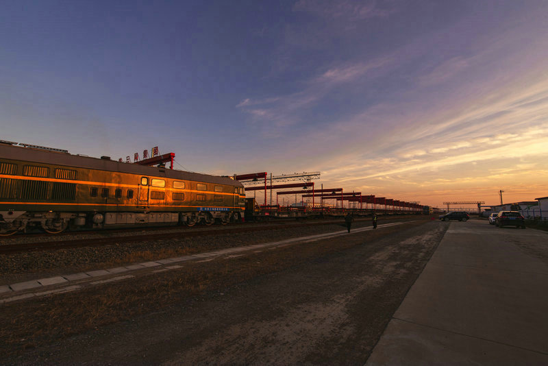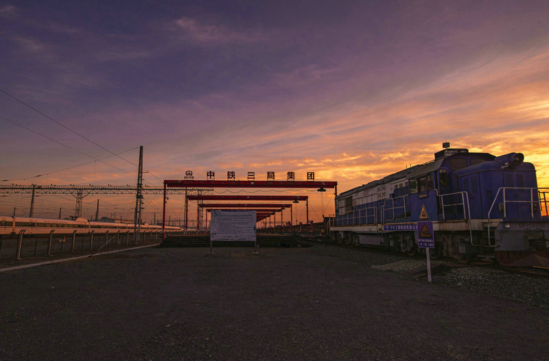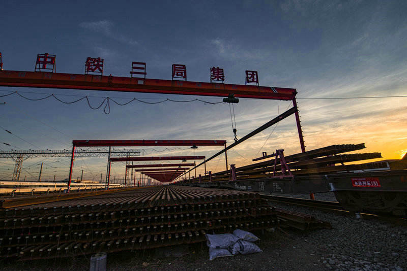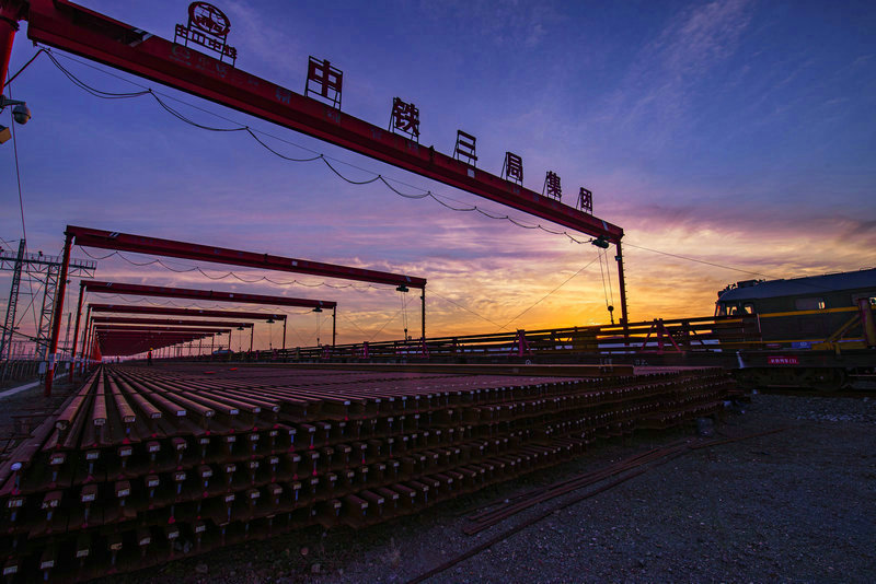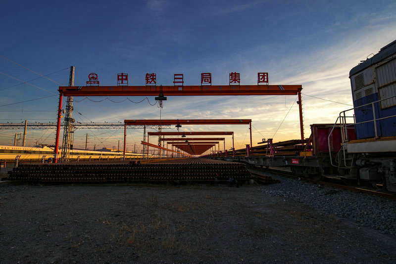夕陽下東津鋪軌基地作業(yè)忙