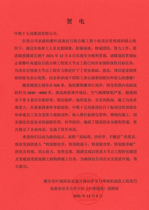 雄孜隧道左洞自2020年9月8日實現(xiàn)進洞作業(yè)以來,項目參建員工恪盡職守,發(fā)揚“缺氧不缺精神,海拔高斗志更高”的精神,僅用了400余個日夜便實現(xiàn)了該隧道貫通的既定目標,業(yè)主稱贊道:“中鐵十五局是一支能打勝仗的隊伍”。